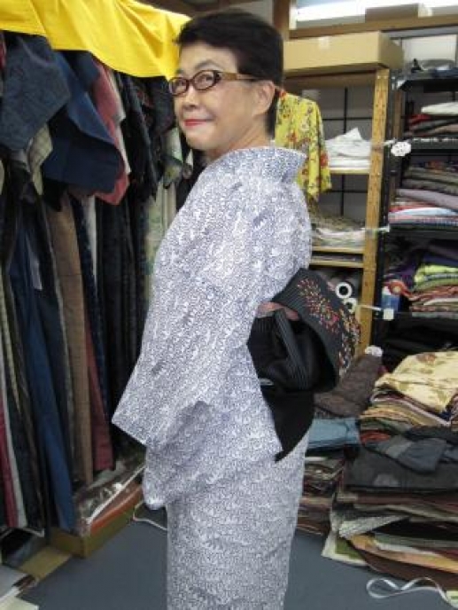 今回は笹模様のポリの絽小紋をお召しに・・・